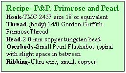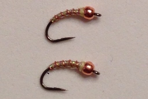 Tied on size 16 hook. Lt. Cahill 6/0 thread. Copper tungsten bead and copper wire. Pearl tinsel on top of thread base in either Flashabou or spool. Also have used opal holographic tinsel.
