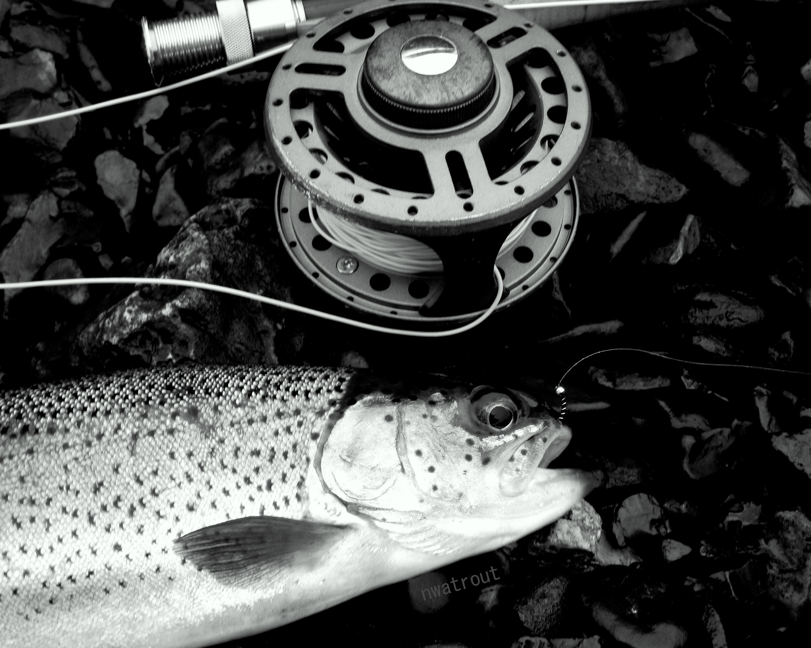 I started off with the morning with the trusty ole black zebra midge and started catching almost immediately. After several netted fish, I switched to the copper midge and rusty midge and did pretty well with those as well. I then tried my version of the sub-micro olive jig that I tied this week and caught one pretty quickly, but had some issues right after that. I had a slight tangle at the end of the rod, so reached up the rod to work it loose, and “SNAP” 2 1/2 feet of my 9 ft rod decided to divorce. My heart sunk as I held the two sections.