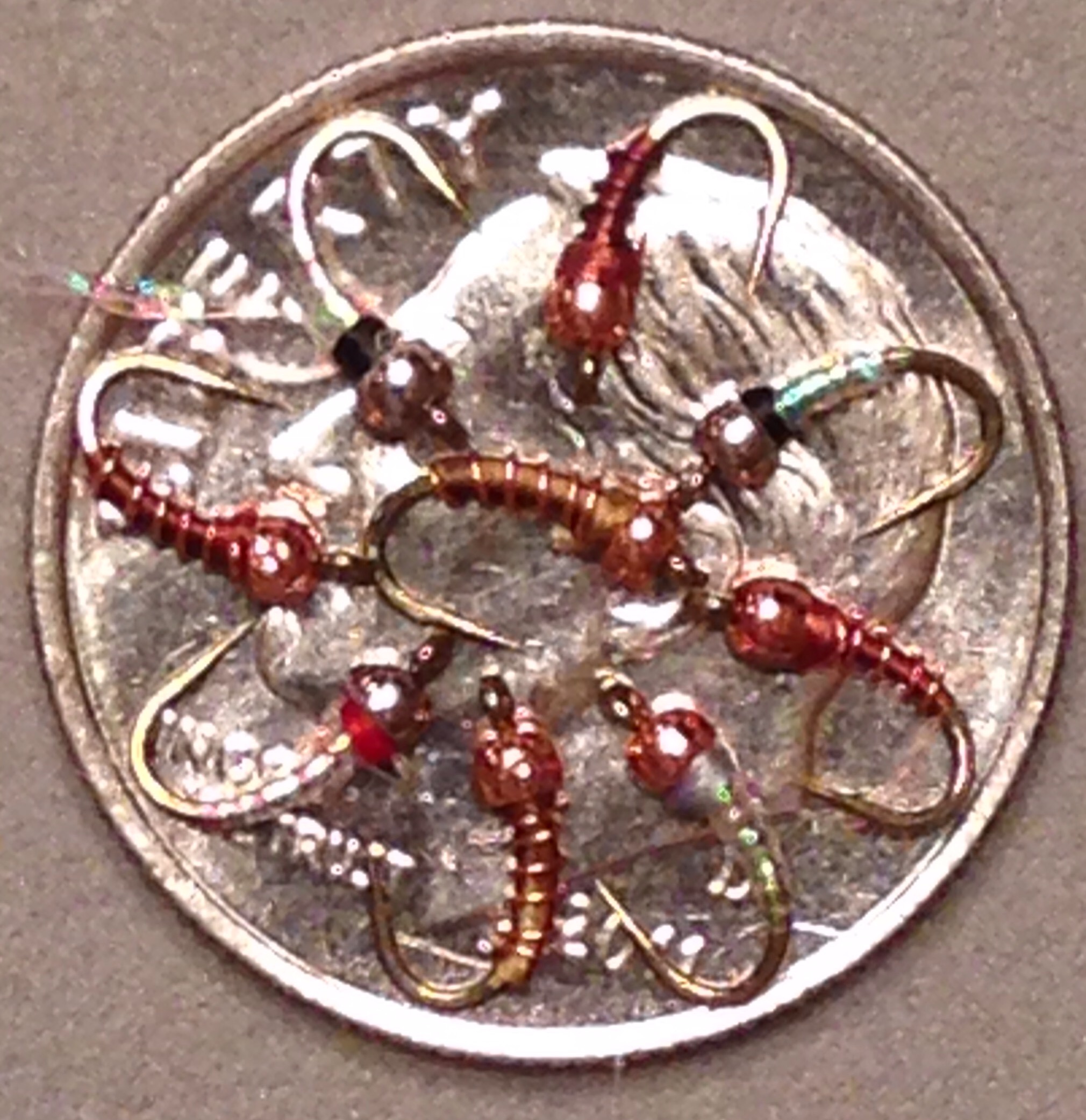 Nine size 22 midges fit on the face of a dime. I was finishing up making my small midges by using up all the size 1/16 tungsten bead heads I bought. Those things are a pain to tie. So hard to handle the hooks and beads and string and vise all in such a small space.