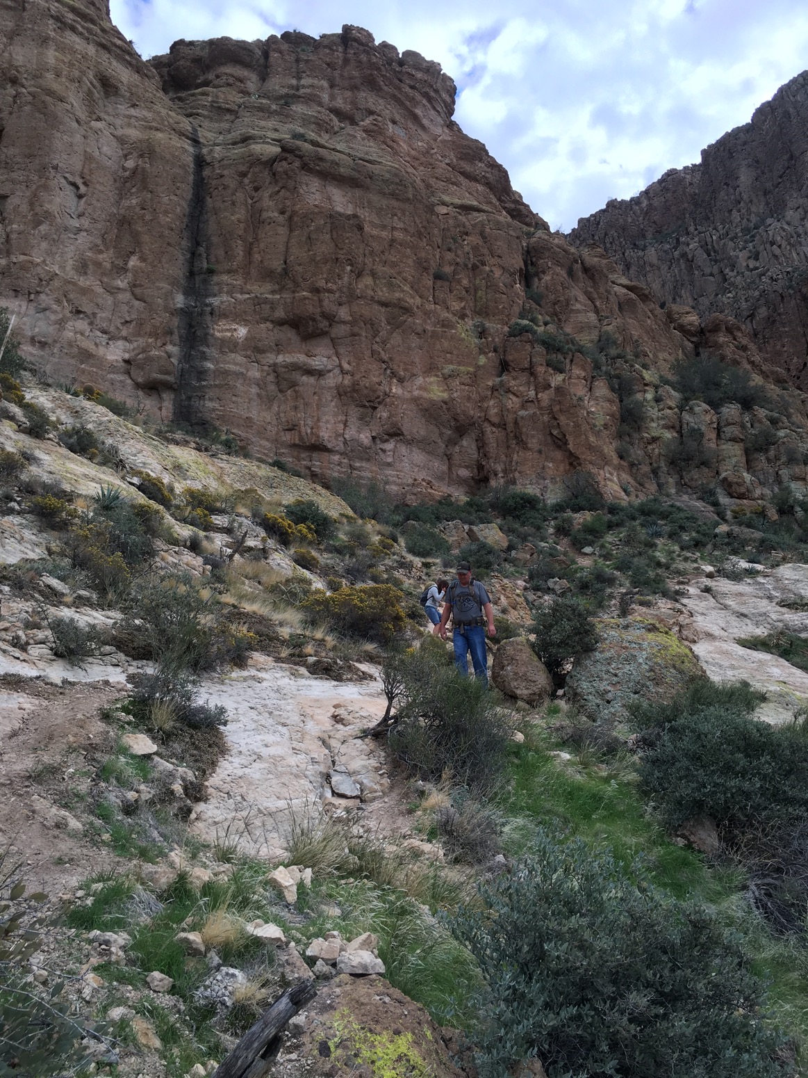 The trail starts easy enough through a creek and up a slight incline passed an old abandon mine. Then you head upward toward the base of the mountain mostly along a ridge line. It’s just over a mile to the base of the mountain where the real fun starts. From here the trail goes nearly vertical for somewhere near a 1/2 mile. There’s at least 1500ft of elevation gain straight up the side of the mountain. The trail is vaguely marked as you switch back up the canyon to the top. We stayed in the main part of the canyon/crevice where you need to bush wack and climb over Boulder after Boulder. At this point you are using your whole body to navigate up the mountain. It’s very strenuous and fairly dangerous. We seemed to go about 100 yards at a time before we took a break to catch our breath and figure out the next section. The teenage boys nearly ran up the mountain without stopping.